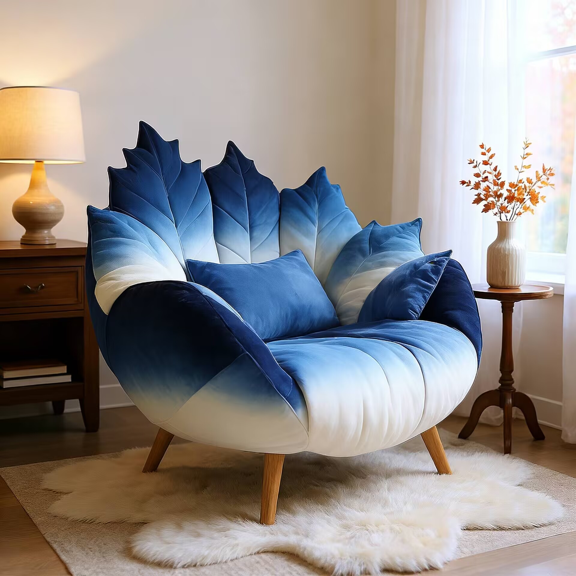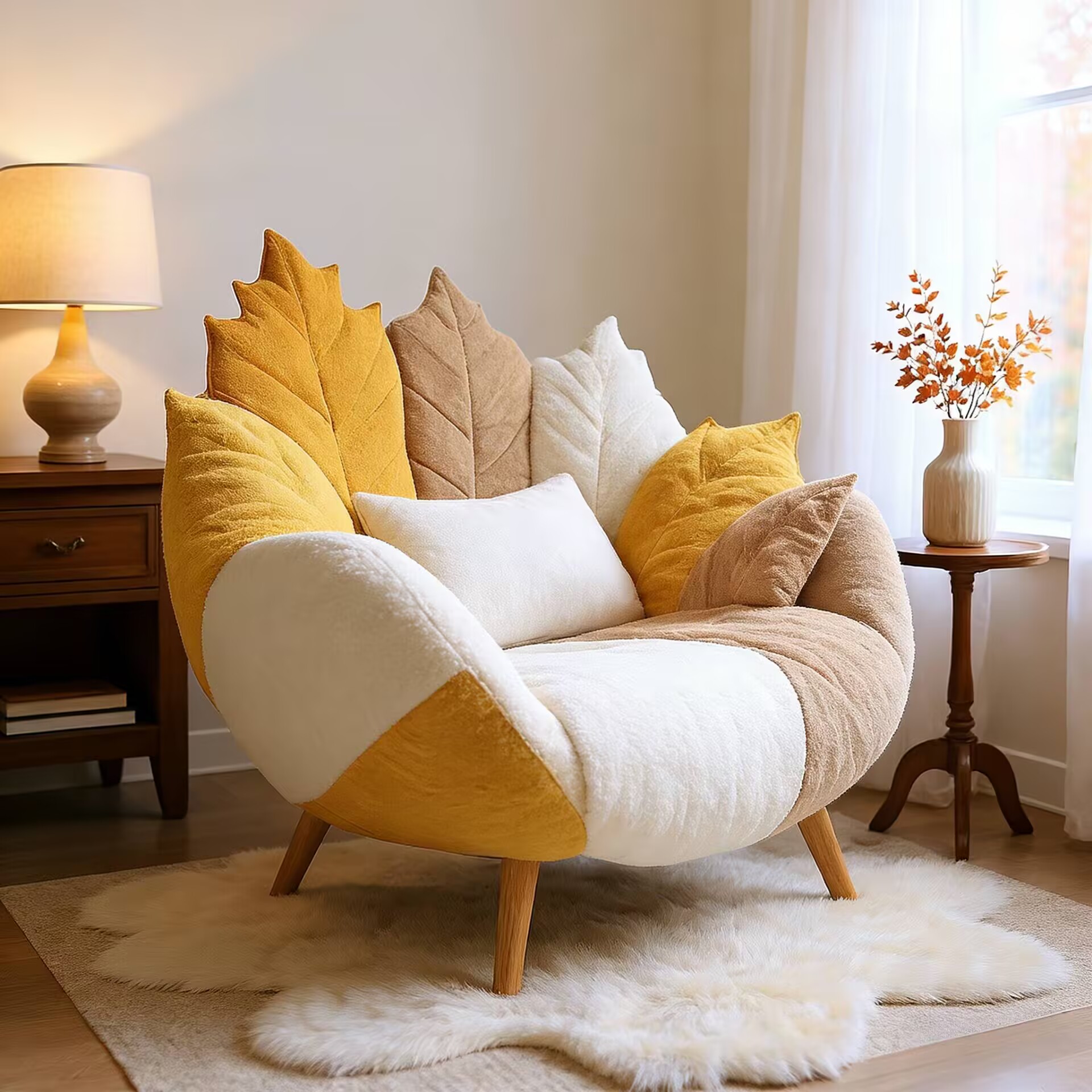 Each leaf serves as an independent cushion, featuring a color gradient ranging from golden yellow to caramel—reminiscent of a stack of real autumn leaves. Visually warm and soft to the touch, it functions as both a piece of furniture and a work of art.