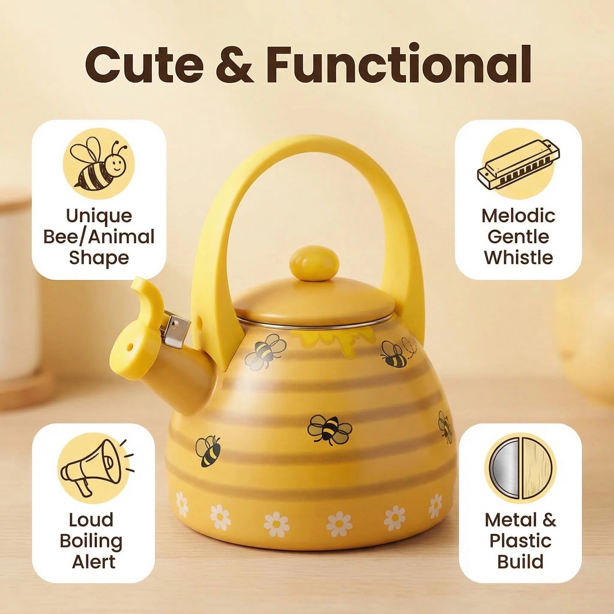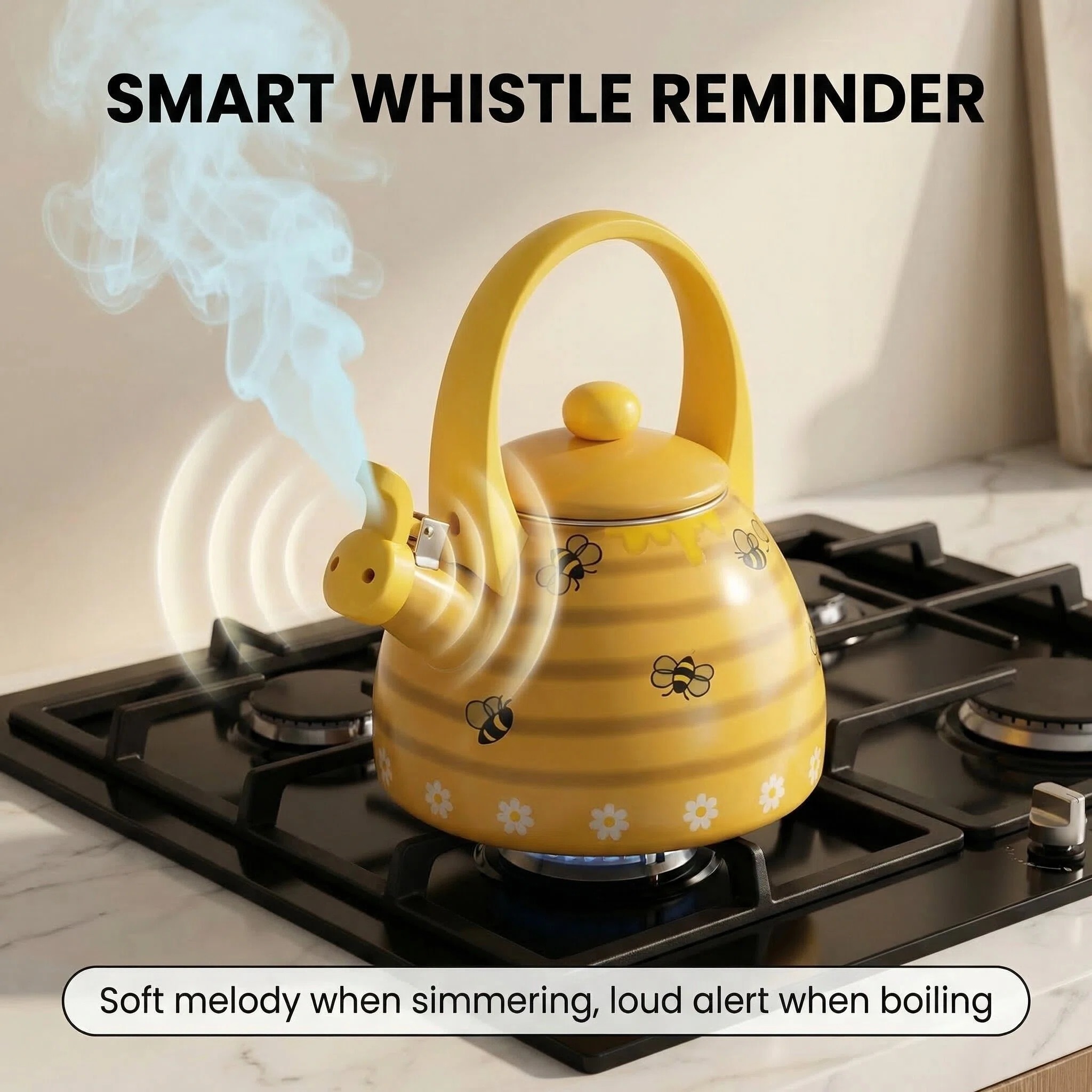 Introducing the Bee Hive Whistling Tea Kettle for Stovetop - a charming and practical addition to enhance your kitchen decor. With its delightful yellow bee hive pattern adorned with buzzing bees and blooming flowers, this stovetop tea kettle is perfect for those who seek a touch of nature-inspired whimsy in their kitchen accessories.