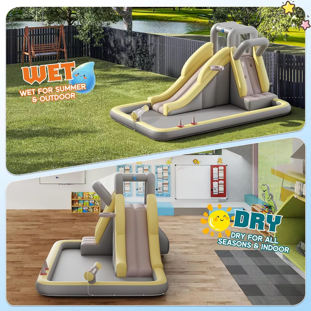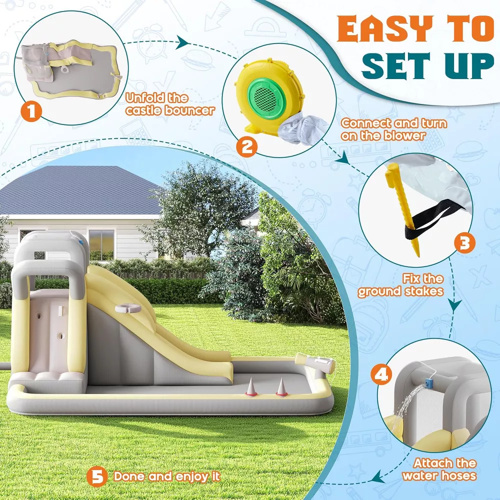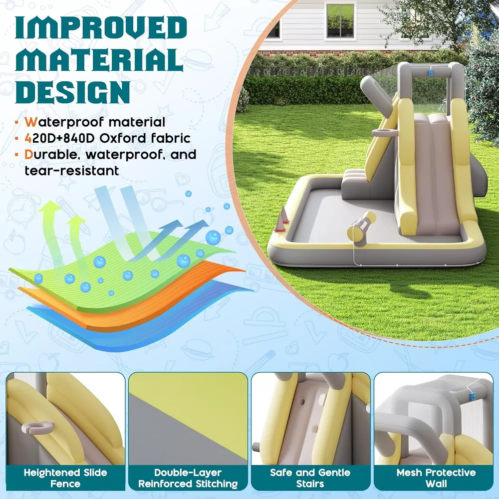 Create endless backyard fun with this inflatable bounce house water slide combo designed for active play. Built with improved 420D+840D Oxford fabric, it delivers durable, waterproof, and tear-resistant performance for energetic kids while providing a spacious play area for group play.