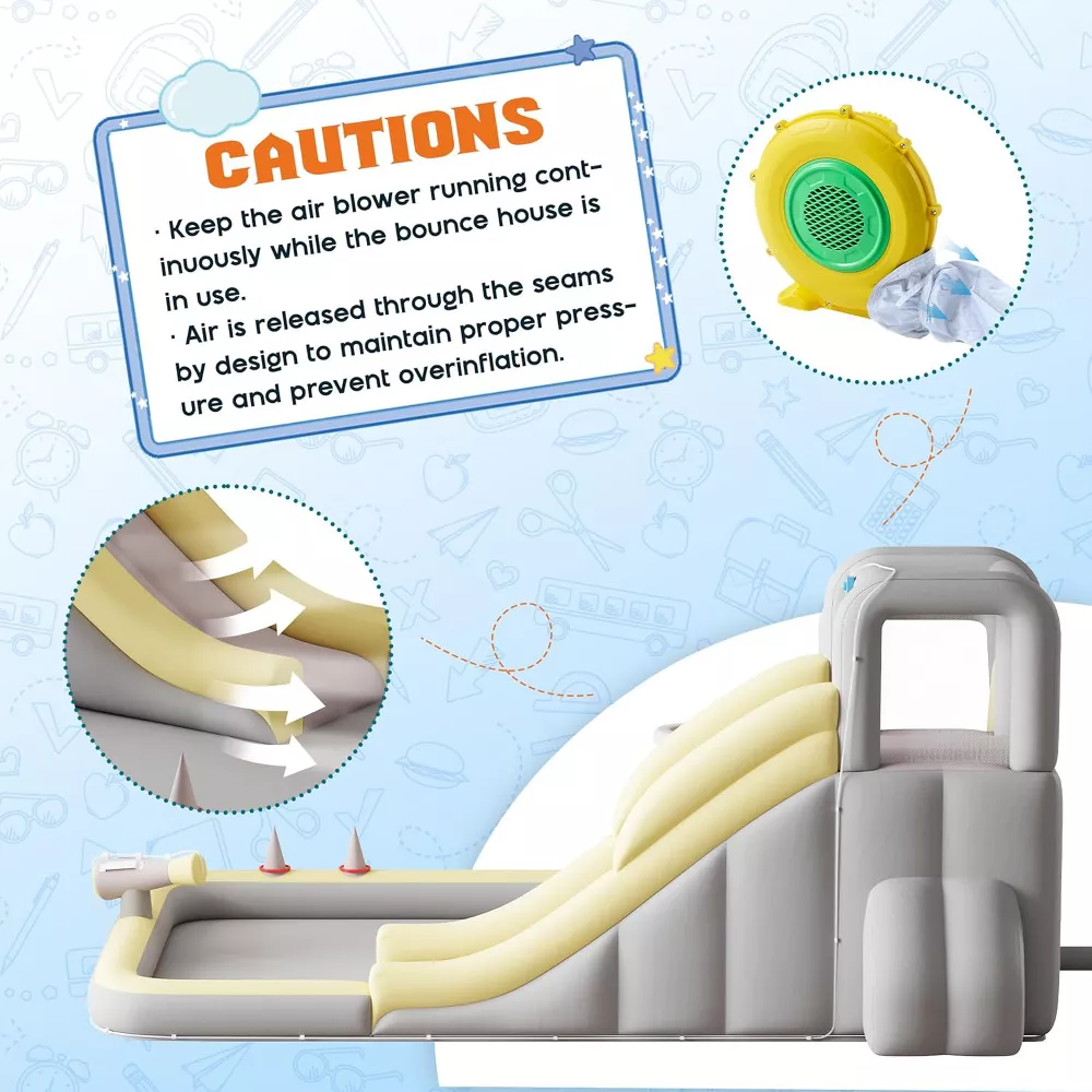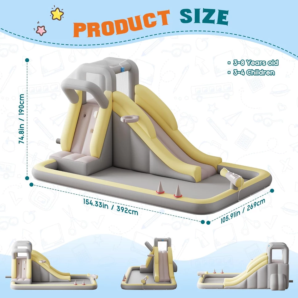 - Play Areas Included: Long Slide, Climbing Wall, Splash Pool/Ocean Ball Pit, Water Gun, Basketball Hoop, Ring Toss Game