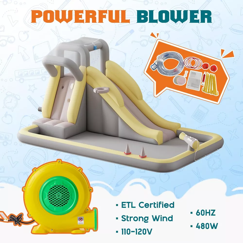 Enjoy multiple play zones including a long slide, climbing wall, splash pool/ocean ball pit space, basketball hoop, ring toss game, and water gun for exciting dry or wet play. Set up is quick with the included air blower, and the inflatable is easy to pack away with the included storage bag for convenient off-season storage.