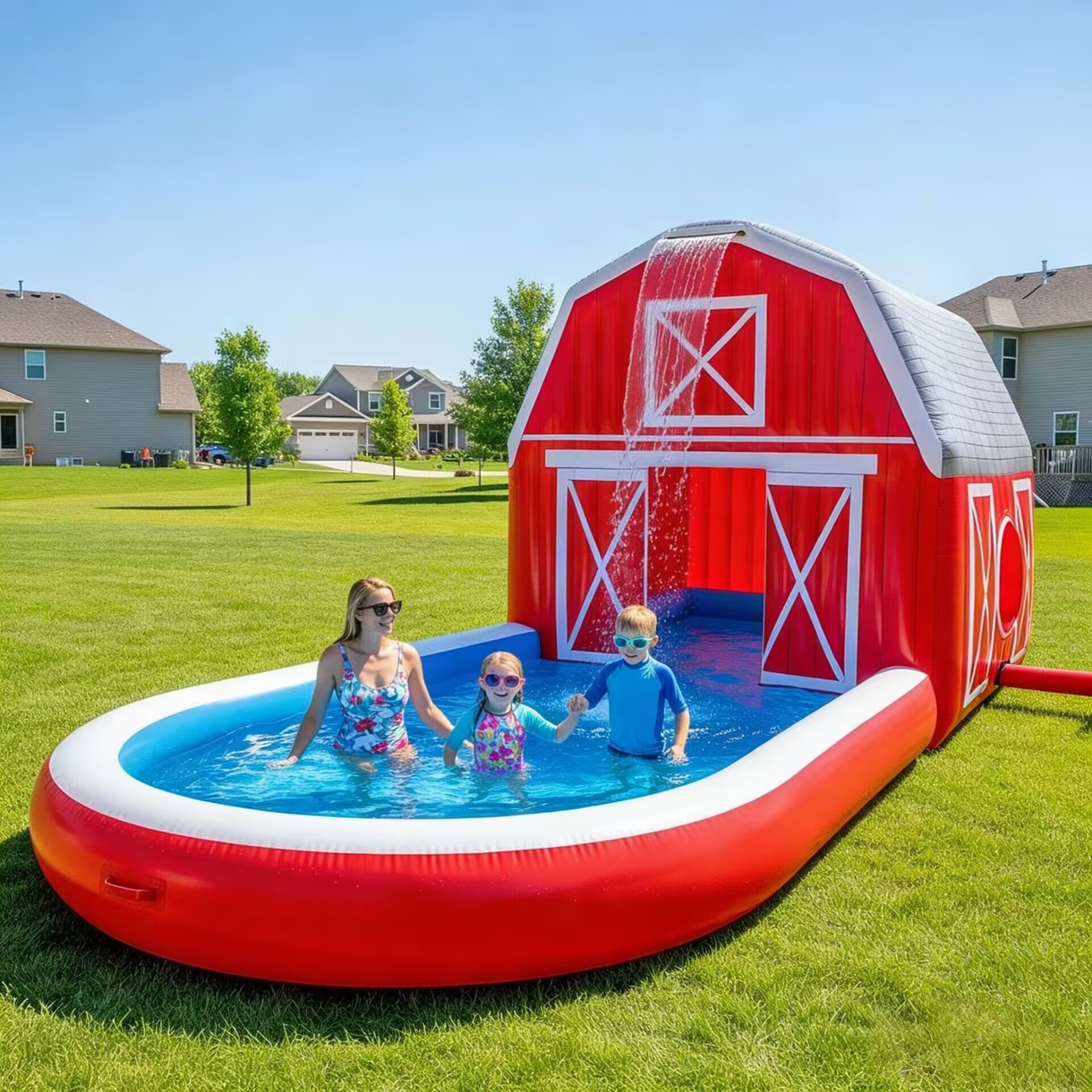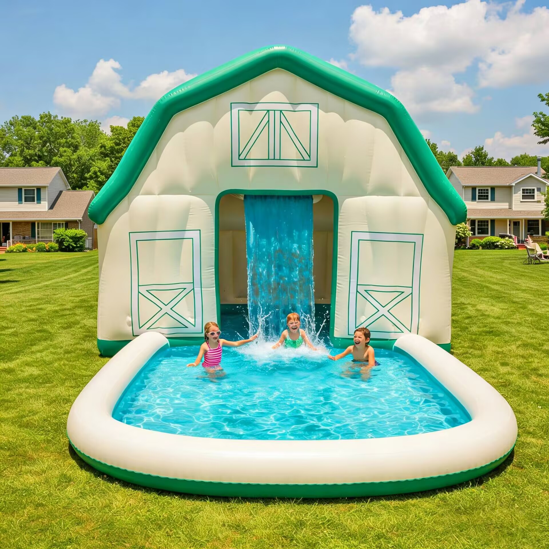 This incredibly creative inflatable water barn playhouse combines a farmhouse with a fountain pool, allowing children to experience the joy of a summer water park right at home. Simply connect the water pipes, and a waterfall cascades down from the "roof," letting children run, play, and cool off in the water—keeping them entertained all summer long.