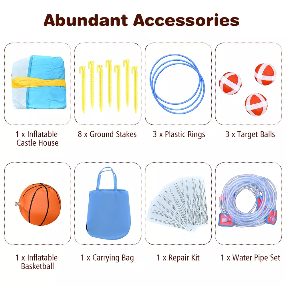Our inflatable water bounce house with bright colors and funny games will be the talk of all the kids! The design of this bouncy castle features the most attractive games for children, such as: a bounce area, a basketball hoop, a water blaster, and two slides, all of which allow children to build friendship with friends. 3 plastic rings, 3 target balls and inflatable basketball will bring more enjoyment to your lovely kids. Made of 420D and 800D Oxford cloth, this inflatable water slide is puncture-resistant and lasting-long. The mesh netting wall combines the advantages of maximum ventilation and reliable protection to provide a comfortable and safe entertainment environment. It is worth mentioning that the unique outlet tube is designed to help the basketball deflate within a few minutes. The portable carrying bag allows you to quickly store all accessories to prevent loss.