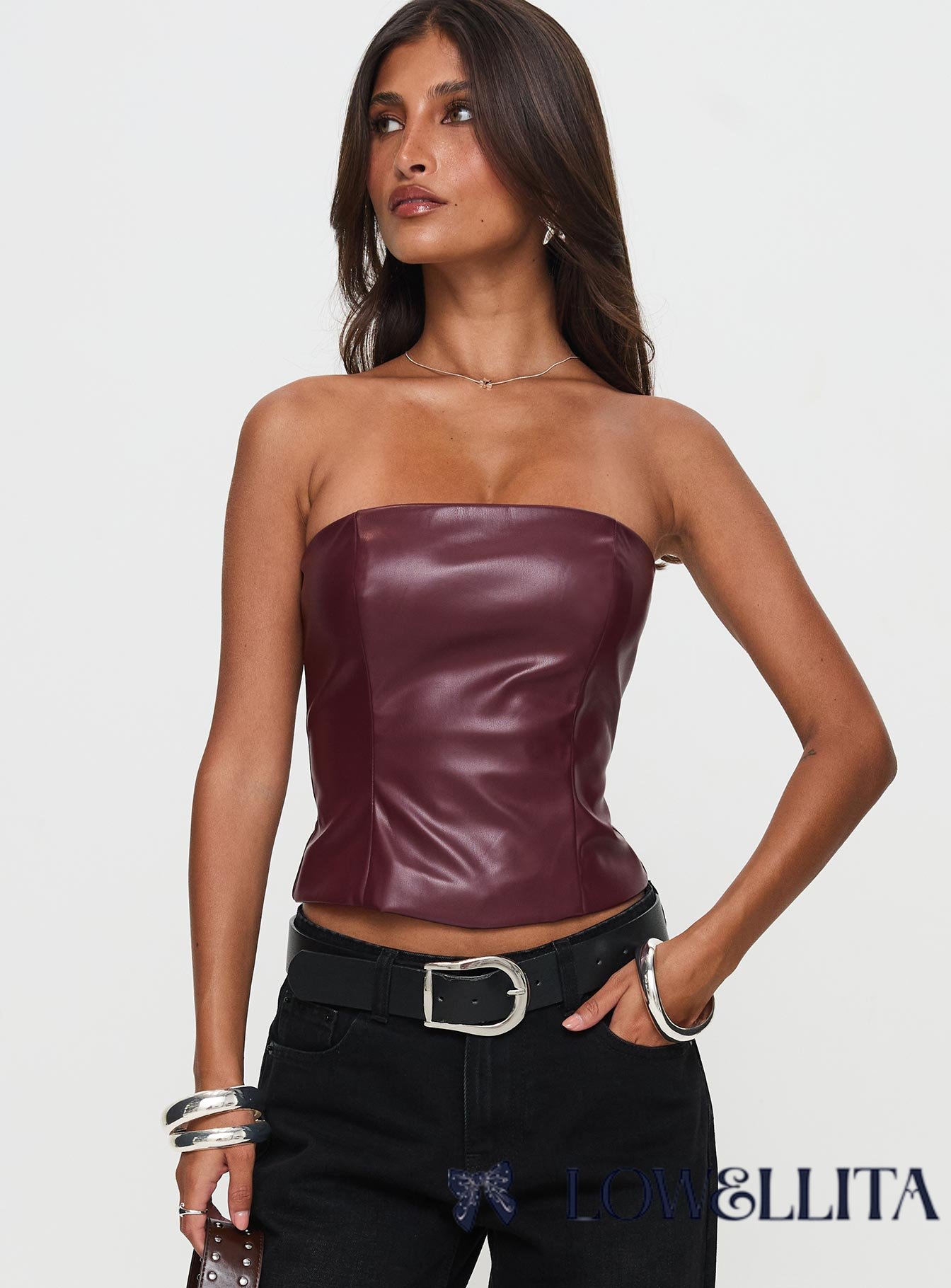 Oaklee Strapless Faux Leather Top Burgundy