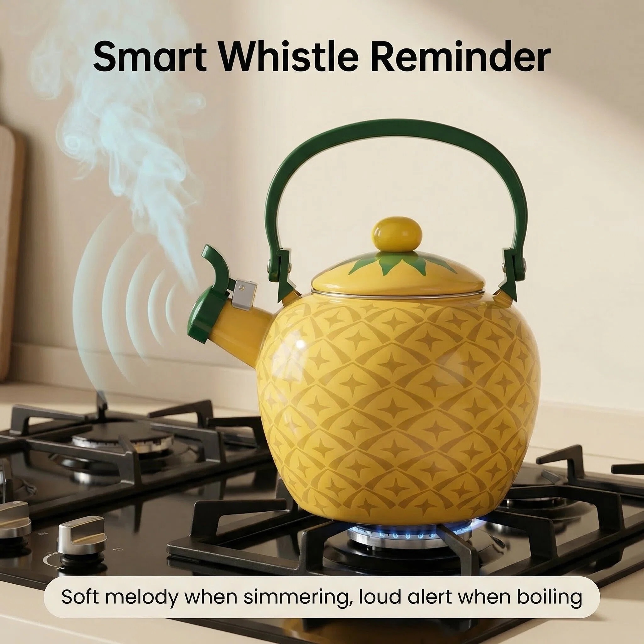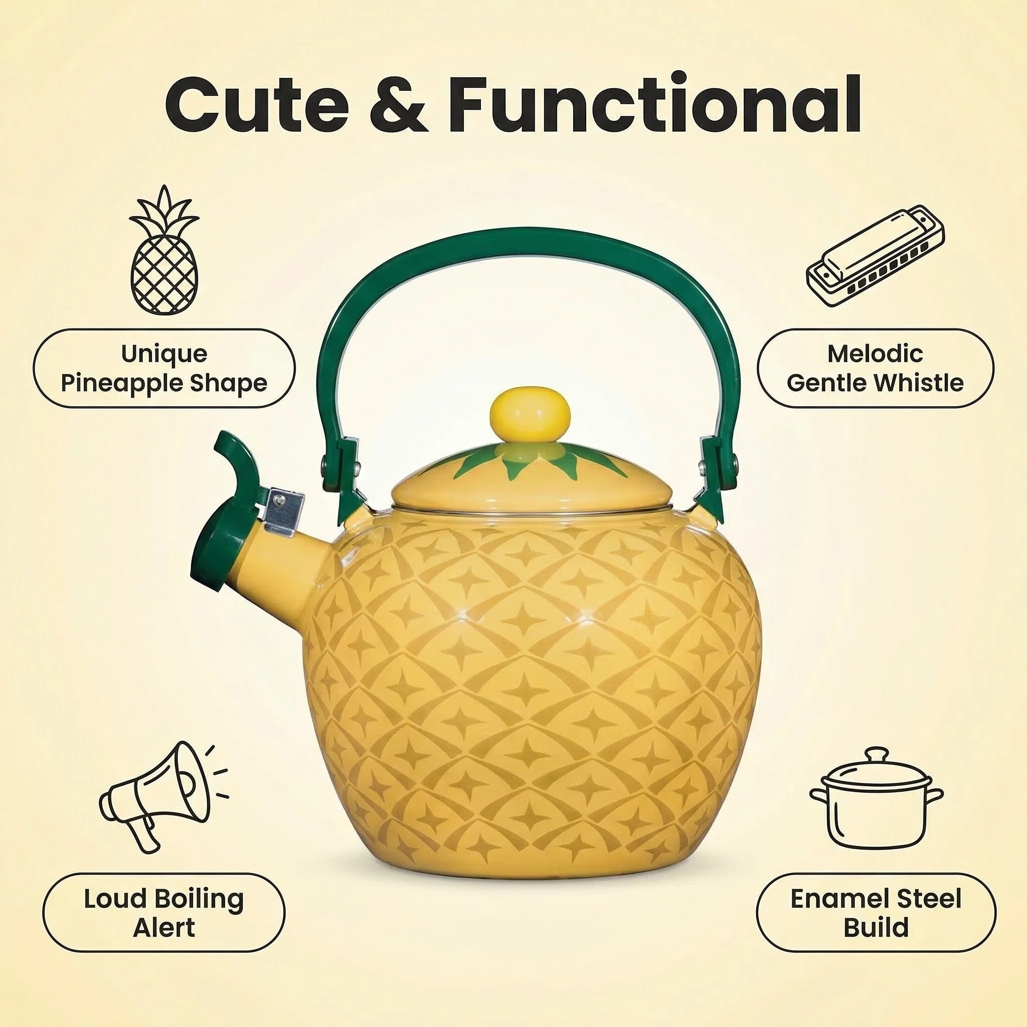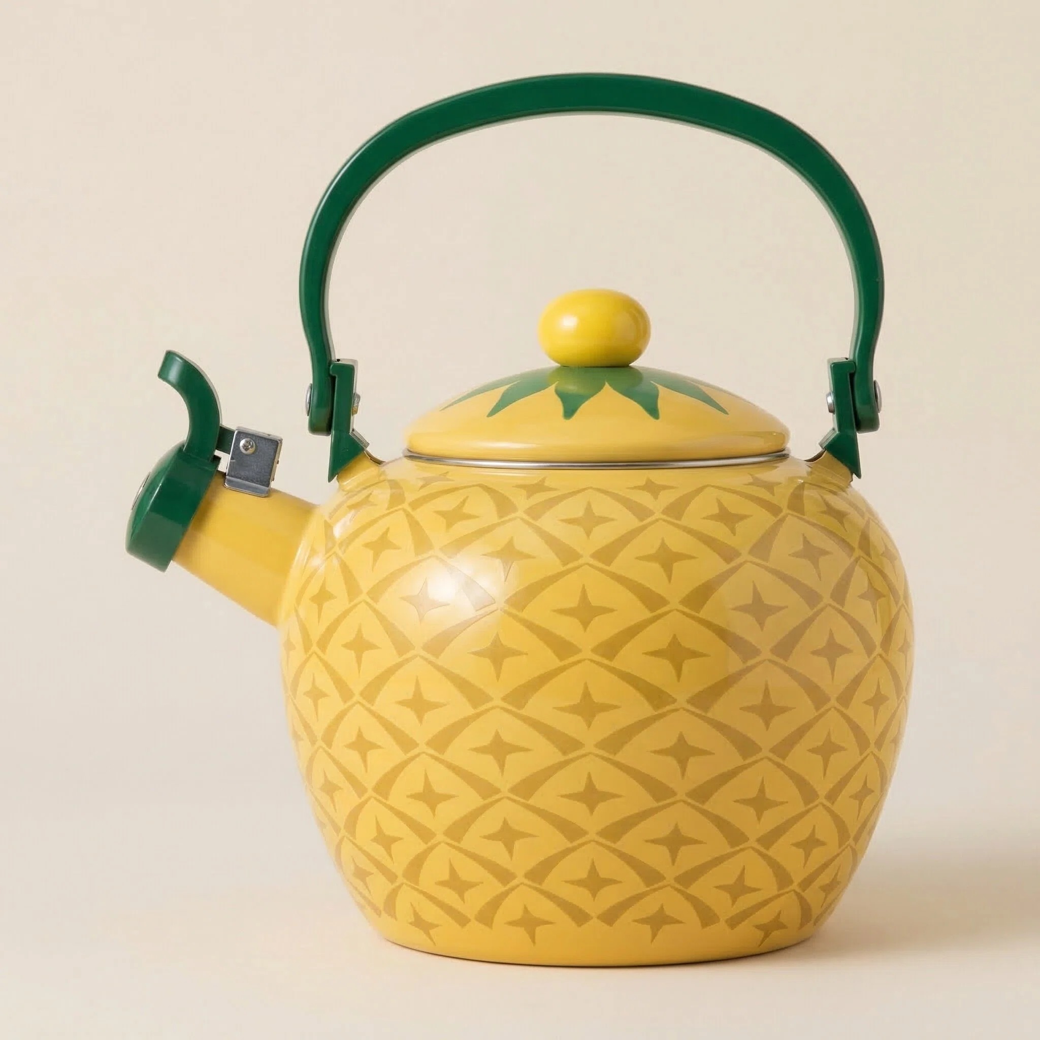 Introducing the Pineapple Whistling Tea Kettle for Stovetop - a charming and practical addition to enhance your kitchen decor. With its delightful pineapple-shaped design and vibrant colors, this stovetop tea kettle is perfect for those who seek a touch of tropical whimsy in their kitchen accessories.