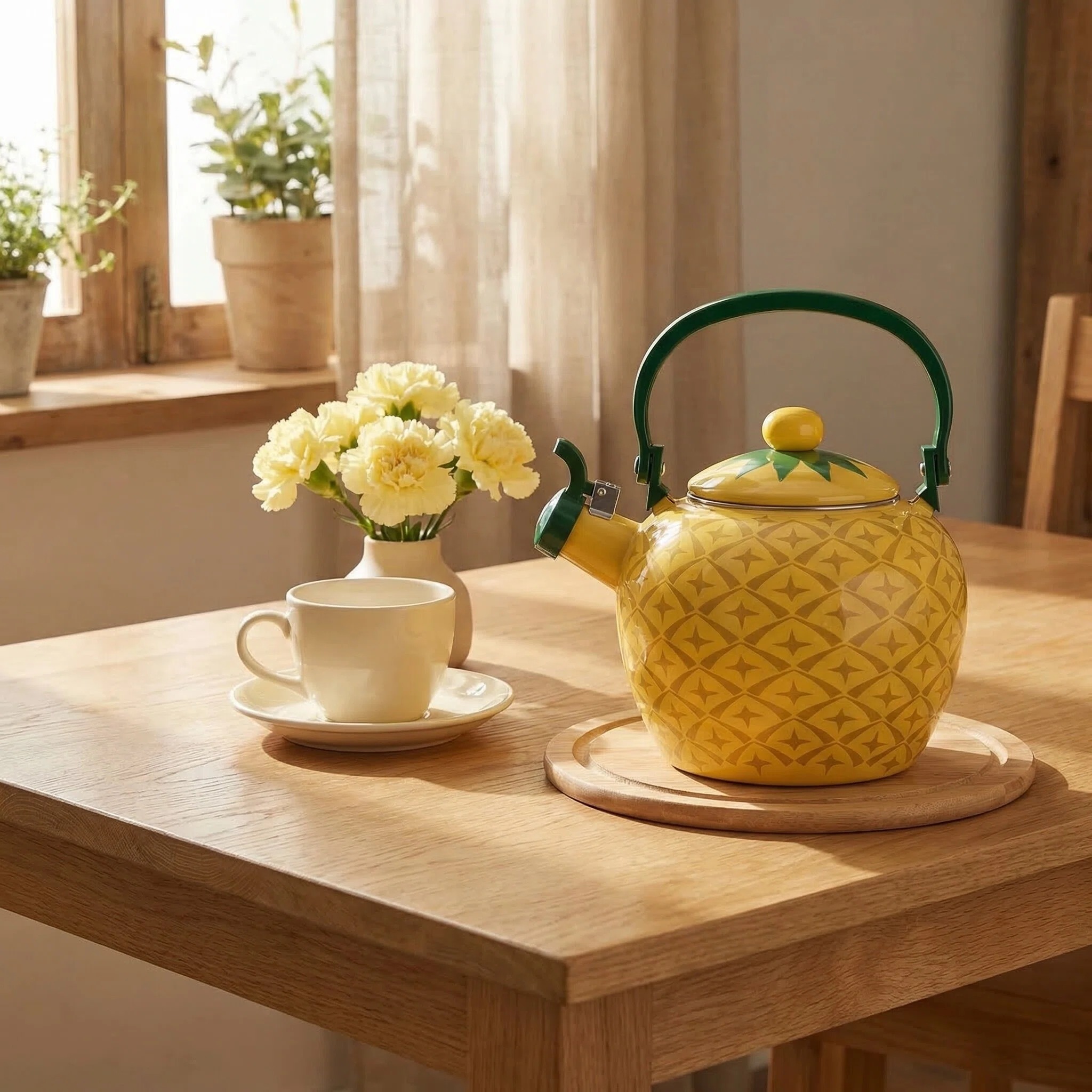 Looking for a practical and stylish gift idea for your loved ones who enjoy pineapple decor or cute kitchen accessories? Look no further than the Pineapple Whistling Tea Kettle. Packaged in an adorable gift box, this tea kettle is the perfect gift for pineapple lovers and a delightful housewarming present that they'll appreciate and use for years to come. Whether you're brewing a cup of tea or adding a pop of color to your kitchen decor, this cute tea kettle is sure to please.