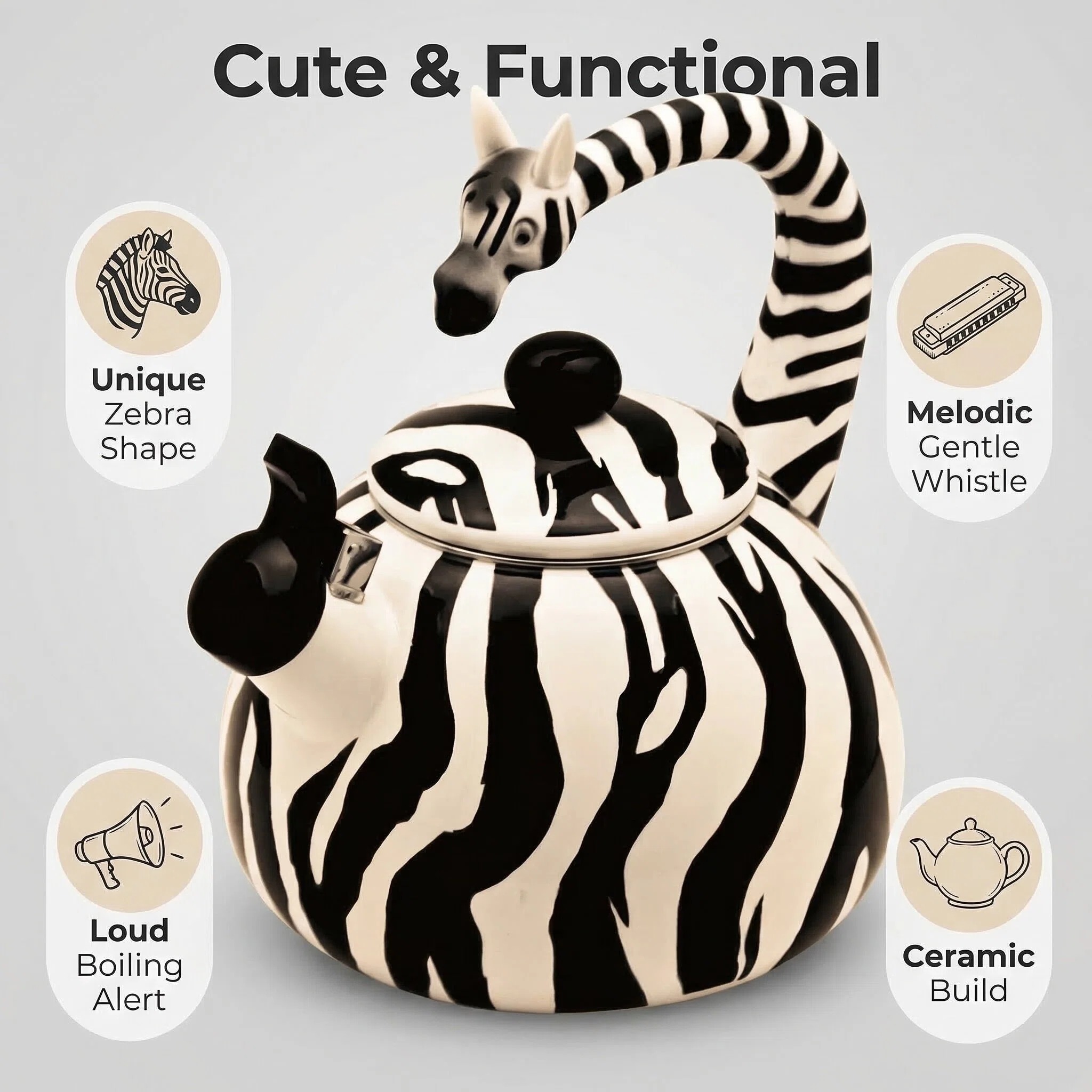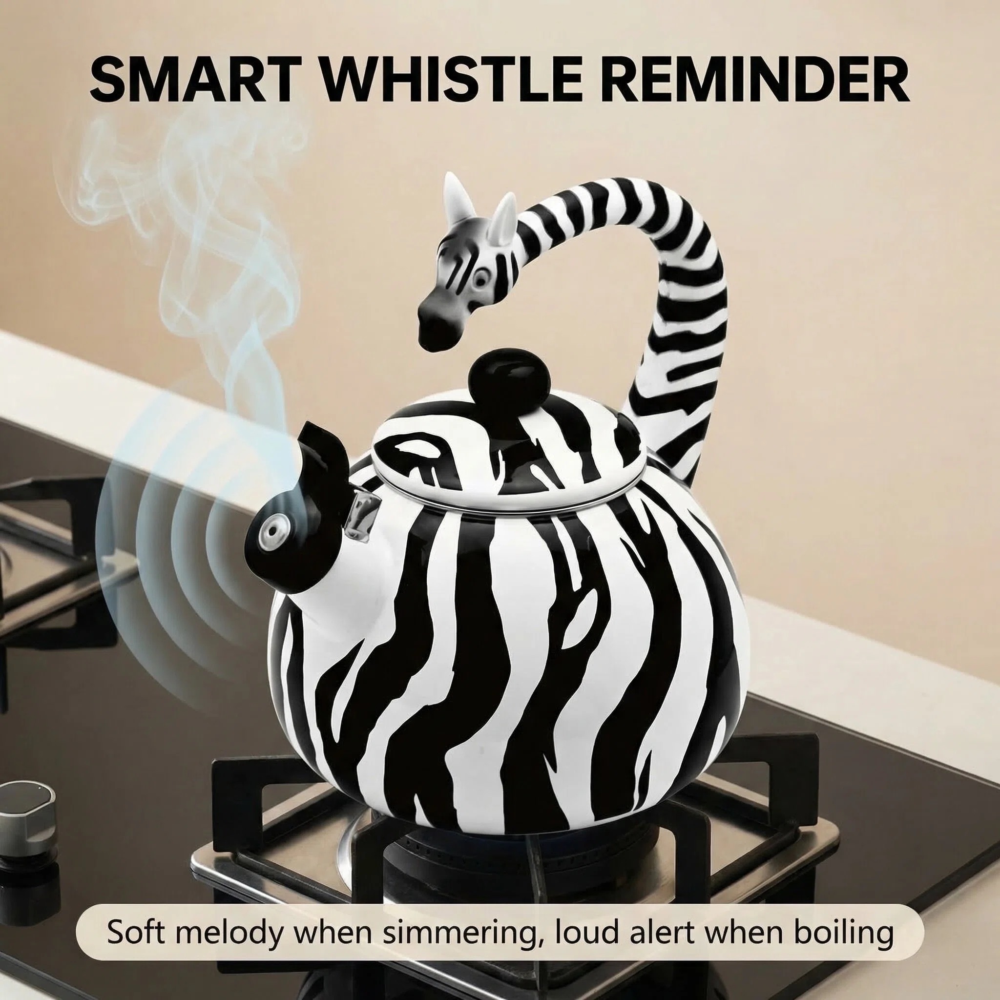 Introducing the Zebra Whistling Tea Kettle for Stovetop - a charming and practical addition to enhance your kitchen decor. With its striking zebra-shaped design featuring bold black and white stripes, this stovetop tea kettle is perfect for those who seek a touch of wild elegance in their kitchen accessories.